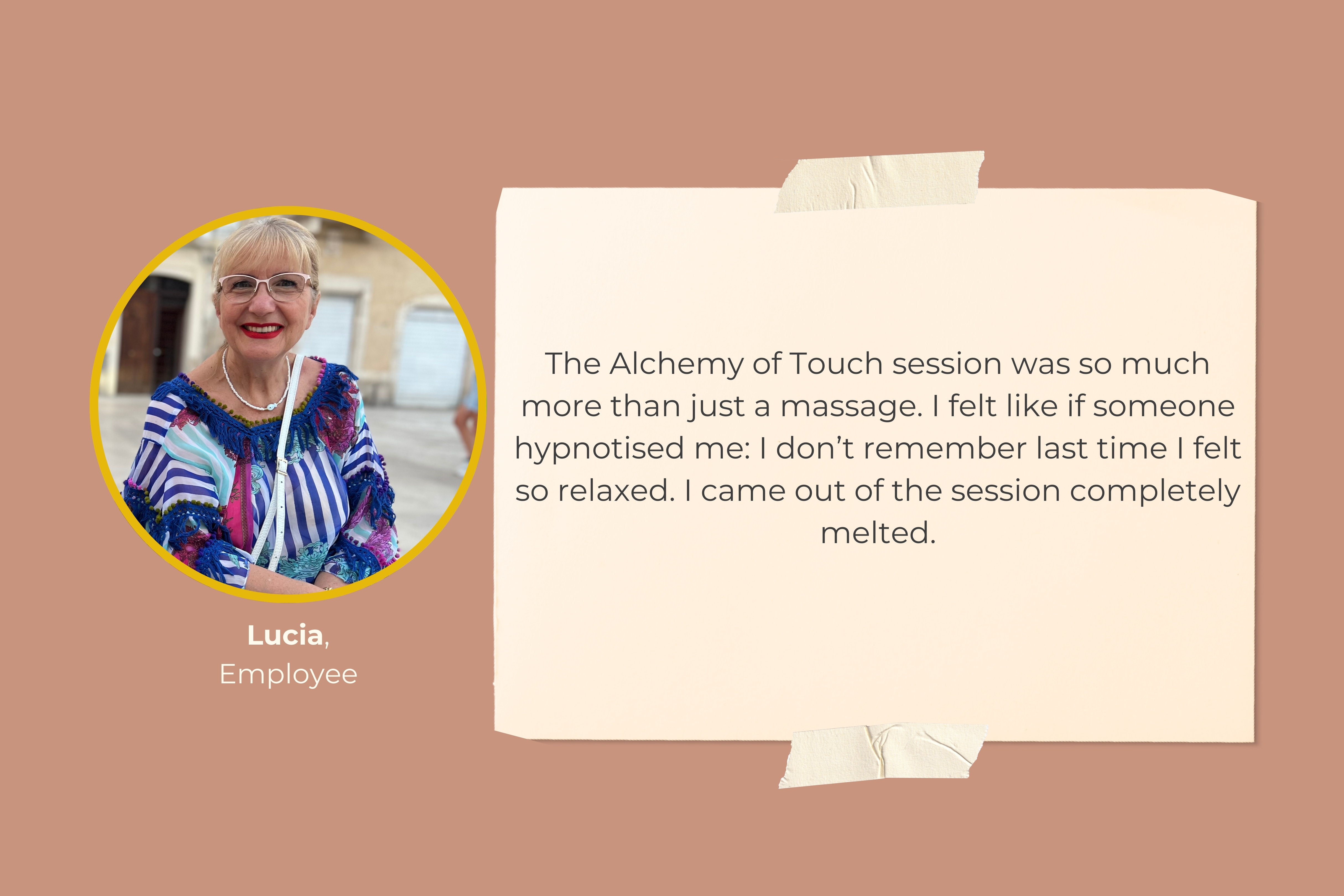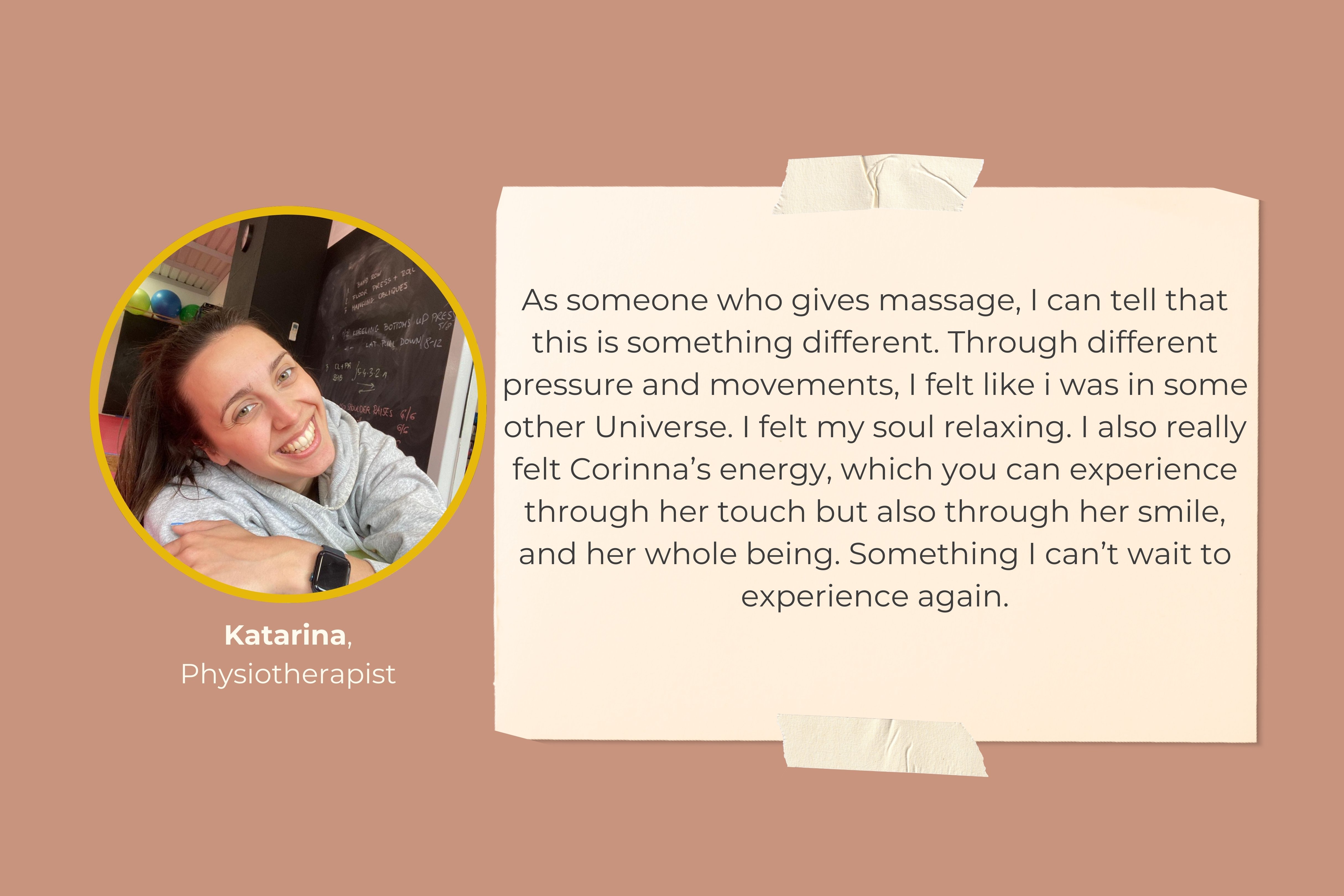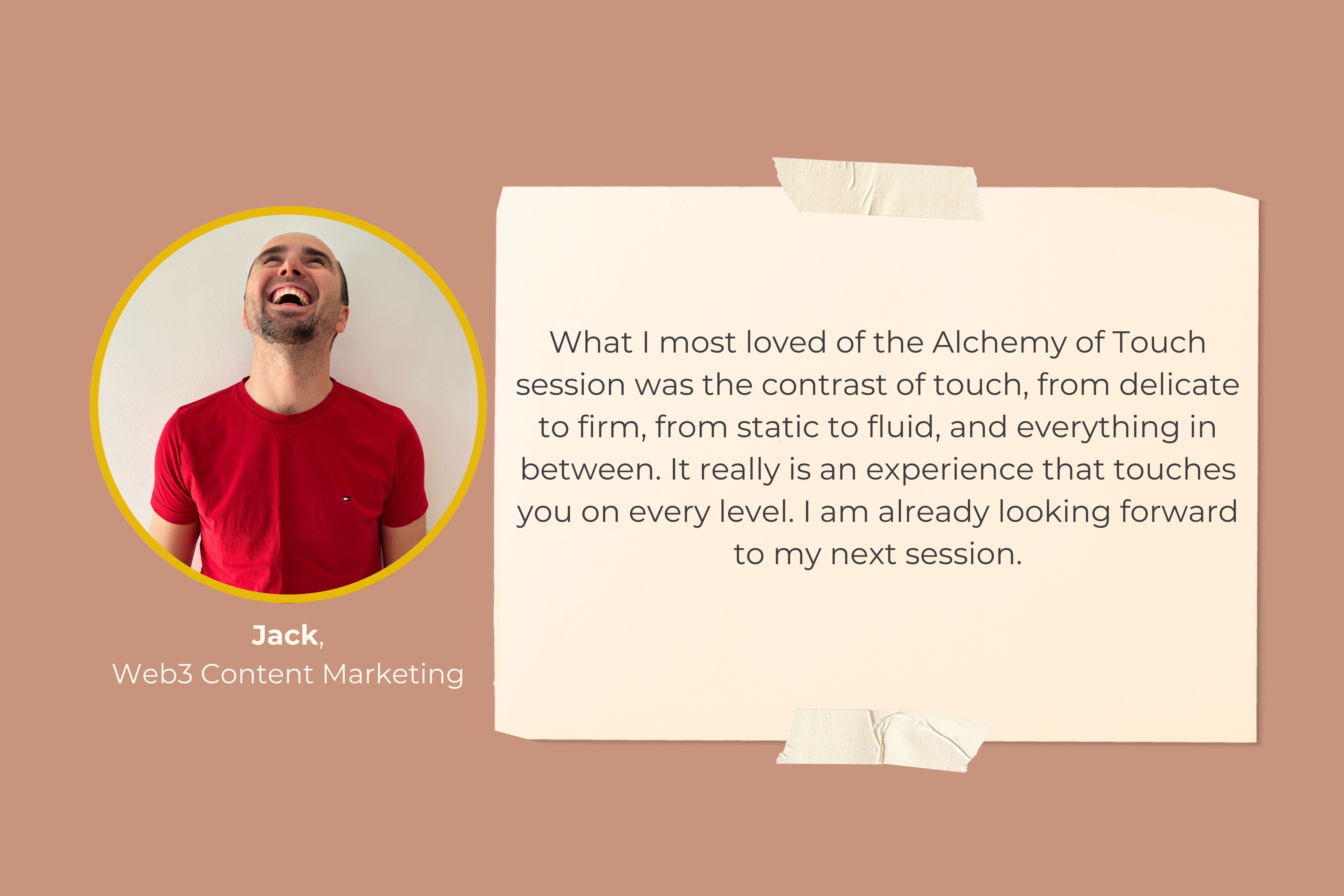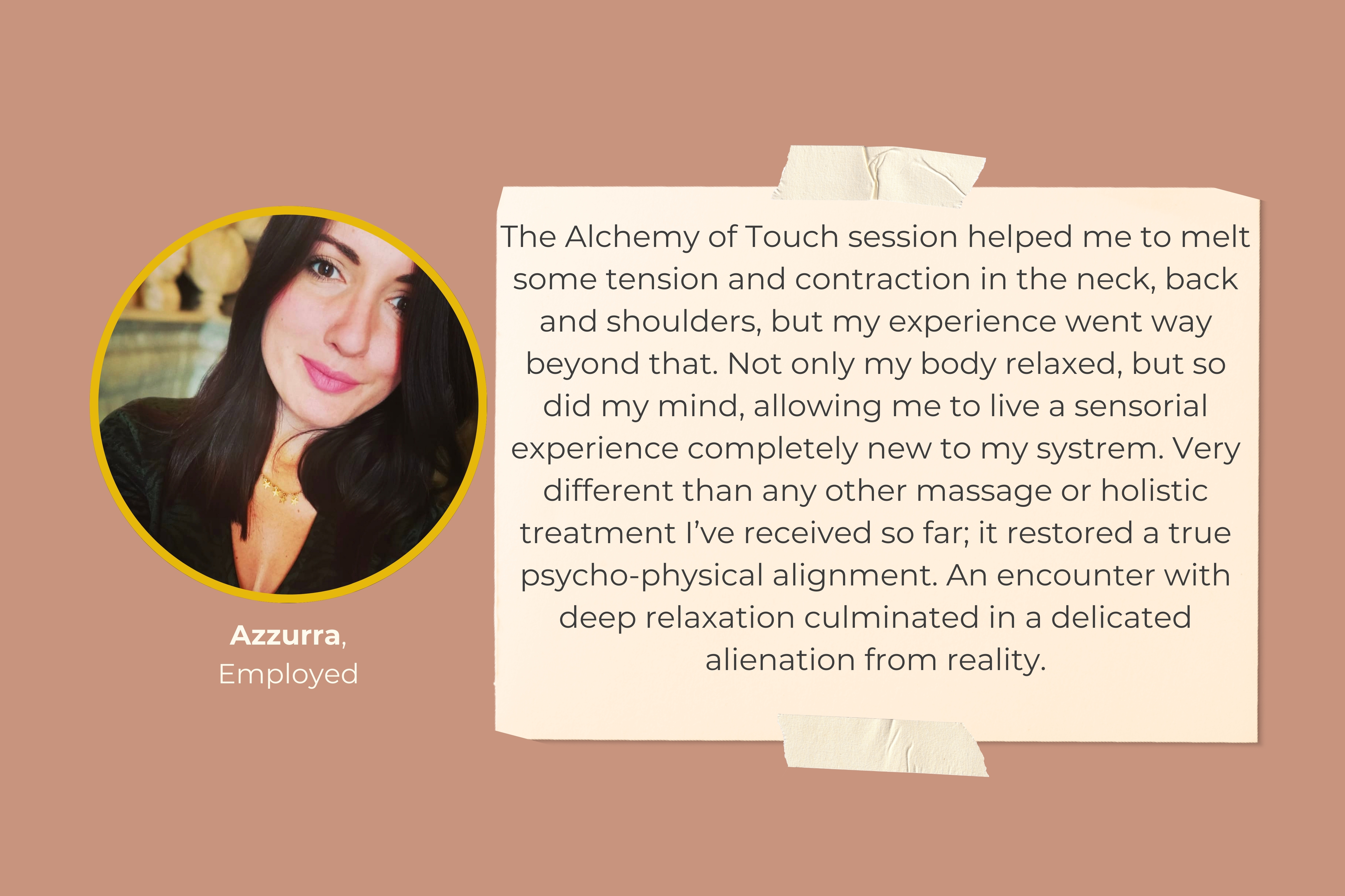 I’ve been trained with Alchemy of Touch™ in a range of techniques rooted in both Western and Eastern culture: form Deep Tissue to Thai Stretches, Digital Pressure, Joint Mobilisation, Fluid Touch™ and Quantum Touch.
